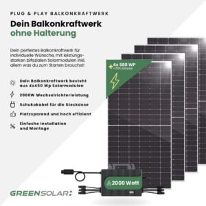 Dein Balkonkraftwerk für dein Zuhause. Mit PLUG&PLAY hast du in wenigen Minuten deinen eigens hergestellten Strom. Einfach auspacken, aufstellen und anstecken, fertig! Dein Basic-Set besteht aus vier bifazialen Modulen mit je 580 Wp Leistung und einem TSUN Mikrowechselrichter 2000W mit Wifi (TSOL-MS2000). Die notwendigen Anschlusskabel zum Wechselrichter, sind natürlich vormontiert. Wähle für den Anschluss an die Steckdose einfach den passenden Netzstecker aus.