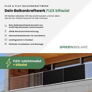 Dieses besonders leichte und flexible Plug & Play Balkonkraftwerk ist ideal für alle, die ihr Solarsystem auf unebenen oder gebogenen Flächen montieren möchten – etwa am Balkongeländer, auf einem Gartenhaus oder an einer Fassadenverkleidung. Zwei flexible bifaziale Photovoltaikmodule mit je 200 Wp und integrierten Ösen ermöglichen eine einfache und sichere Befestigung. Der mitgelieferte HM-400 Mikrowechselrichter wandelt den erzeugten Strom zuverlässig in netzkonformen Wechselstrom um und speist ihn direkt ins Hausnetz ein. Dank vormontierter Anschlusskabel und mitgelieferter Edelstahlkabelbinder ist das System in wenigen Minuten einsatzbereit. Der passende Netzstecker kann individuell ergänzt werden – je nach Anschlussart. Ideal für alle, die eine clevere, platzsparende und sofort einsatzfähige Solarstromlösung suchen.