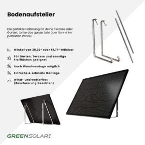 Der Bodenaufsteller für 3 Module bietet dir eine stabile und effektive Lösung, um dein Balkonkraftwerk am Boden zu platzieren – ganz ohne Dachinstallation. Die Module werden quer montiert und lassen sich wahlweise in einem Neigungswinkel von 28,23° oder 61,77° aufstellen, was dir eine optimale Ausrichtung zur Sonne über das ganze Jahr hinweg ermöglicht. Die Aufstellung kann flexibel auf Bodenflächen wie Garten, Terrasse oder Hof erfolgen. Dank der durchdachten Konstruktion ist auch eine Wandmontage im Winkel von 61,77° möglich. Das Gestell ist aus witterungsbeständigen Materialien gefertigt und für den dauerhaften Außeneinsatz konzipiert. So kombinierst du maximale Erträge mit minimalem Aufwand. Alle Details zur Montage und Beschwerung findest du in der Anleitung im Downloadbereich.