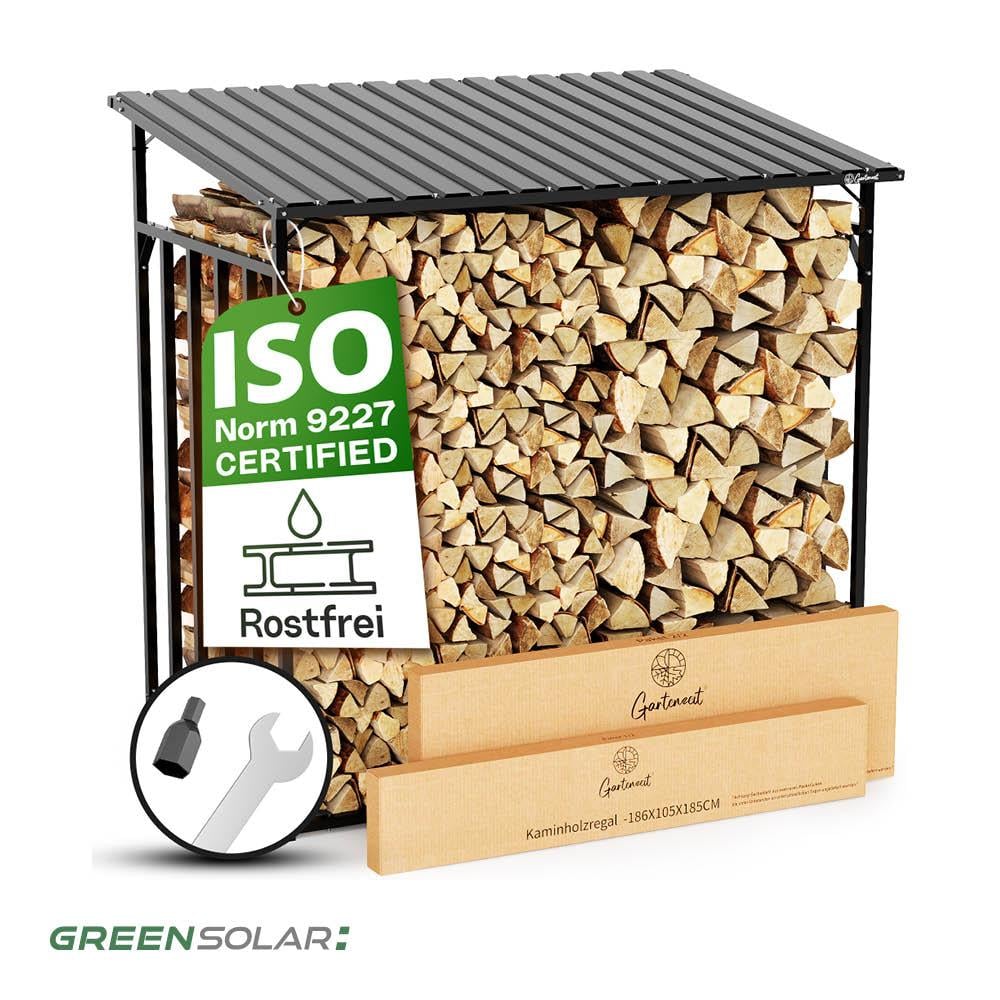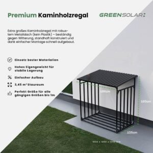 Unser hochwertiges Kaminholzregal vereint modernes Design mit maximaler Funktionalität. Die stabile Konstruktion aus verzinktem, pulverbeschichtetem Stahl schützt dauerhaft vor Witterung, Rost und UV-Strahlung. Das Eigengewicht von 49 kg bietet einen sehr sicheren Stand. Die Lagerkapazität von 3,45 m³ ermöglicht eine deutlich größere Holzmenge als bei herkömmlichen Lösungen – ideal auch für 1-Meter-Stücke. Dank der offenen Bauweise ist eine optimale Belüftung gewährleistet. Der Aufbau gelingt schnell und unkompliziert mit der beiliegenden Anleitung und dem passenden Werkzeug.