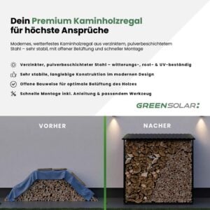 Unser hochwertiges Kaminholzregal vereint modernes Design mit maximaler Funktionalität. Die stabile Konstruktion aus verzinktem, pulverbeschichtetem Stahl schützt dauerhaft vor Witterung, Rost und UV-Strahlung. Das Eigengewicht von 49 kg bietet einen sehr sicheren Stand. Die Lagerkapazität von 3,45 m³ ermöglicht eine deutlich größere Holzmenge als bei herkömmlichen Lösungen – ideal auch für 1-Meter-Stücke. Dank der offenen Bauweise ist eine optimale Belüftung gewährleistet. Der Aufbau gelingt schnell und unkompliziert mit der beiliegenden Anleitung und dem passenden Werkzeug.