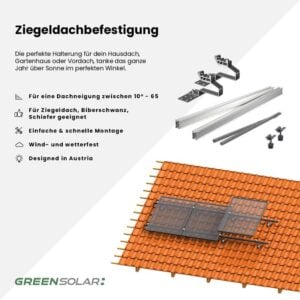 Mit dem Grundset-Ziegeldach 1er Set montierst du ein Solarmodul sicher und stabil auf deinem Ziegeldach – ganz gleich, ob auf dem Hauptdach, dem Gartenhaus oder dem Vordach deines Hauses. Die Befestigung erfolgt mittels robuster Dachhaken, die direkt an der Dachkonstruktion angebracht und mit Trageschienen und Endklemmen kombiniert werden. Für die Montage eines einzelnen Glasmoduls reicht dieses Grundset vollkommen aus. Du kannst es aber flexibel erweitern: Bis zu drei zusätzliche Module lassen sich durch separat erhältliche Erweiterungssets in einer Reihe anbringen. Das System ist langlebig, witterungsbeständig und auf eine einfache Selbstmontage ausgelegt – mit allen wichtigen Infos in der Montageanleitung im Downloadbereich. Ideal für alle, die Solarenergie auf vorhandenen Ziegeldächern effizient und elegant nutzen möchten.